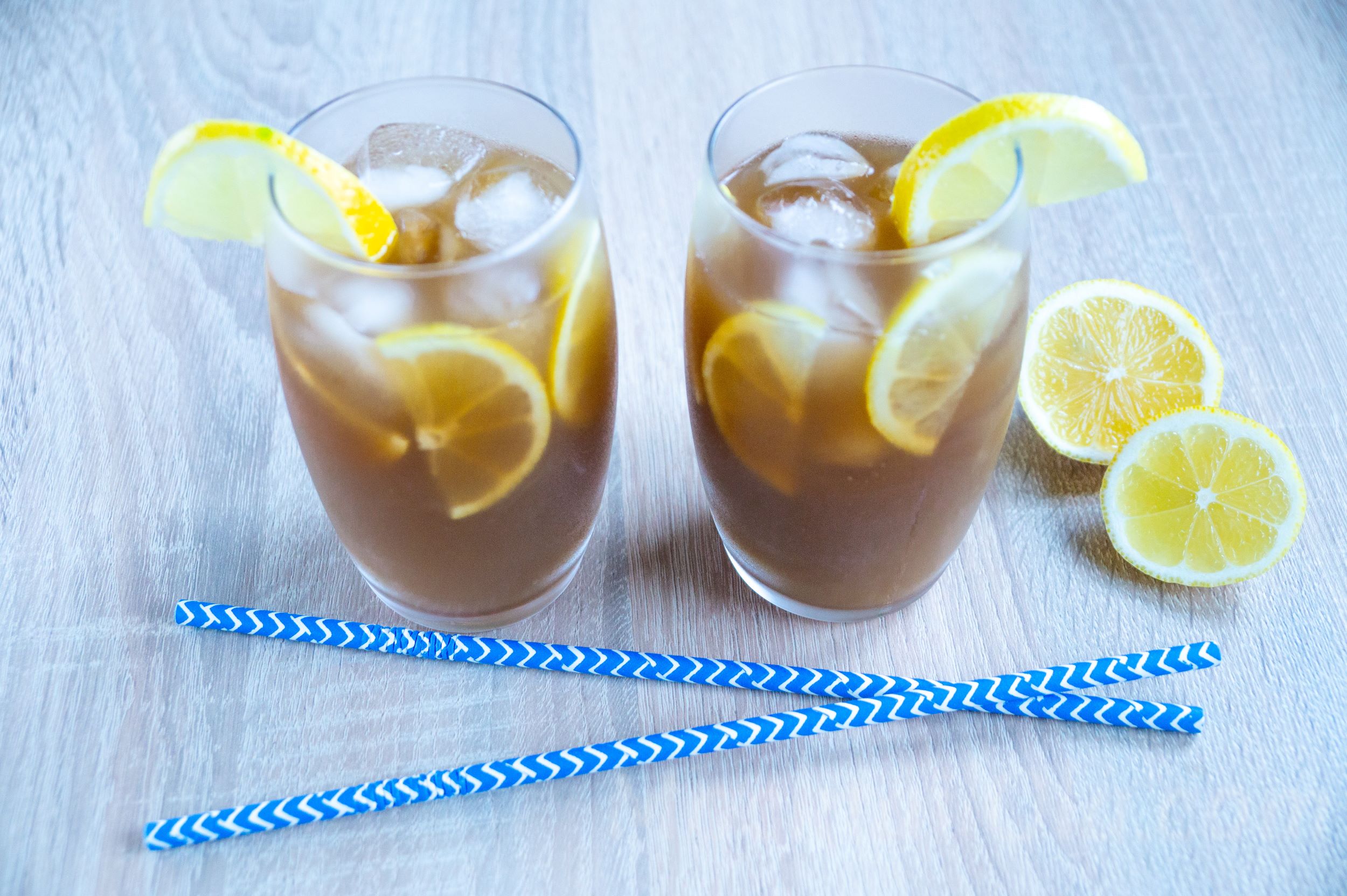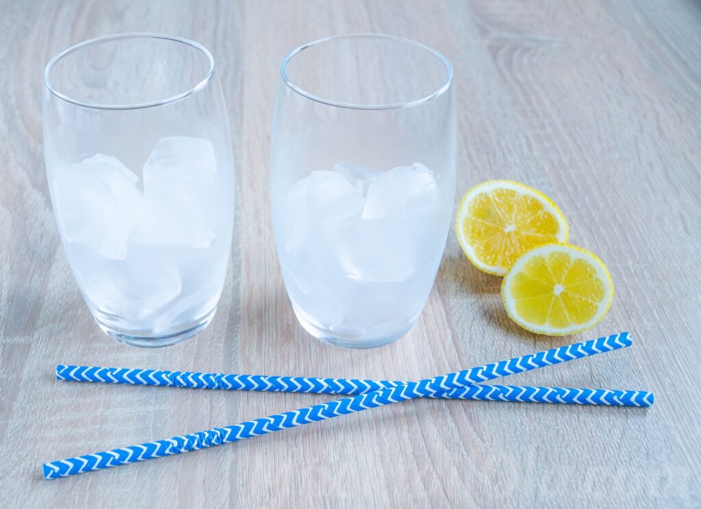 - Garnish the glass with lemon and add straws.